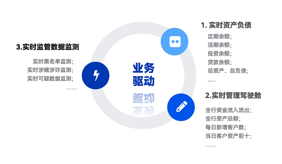 場景二:實時管理駕駛艙:通過實時獲取交易動賬,對全行級別的資金流入流出金額、客戶資產、申貸金額及人數等指標進行實時展示;