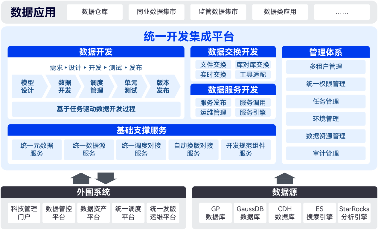 結合南京銀行的數字能力現狀,長亮科技項目團隊遵循“利舊原則”,對其現有數據產品進行全面整合與升級,集成了離線開發平臺、數據交換系統、統一調度平臺及大數據接口發布系統,并打通了數據資產平臺、數據管控平臺、各源系統、科管及統一運維發版平臺。