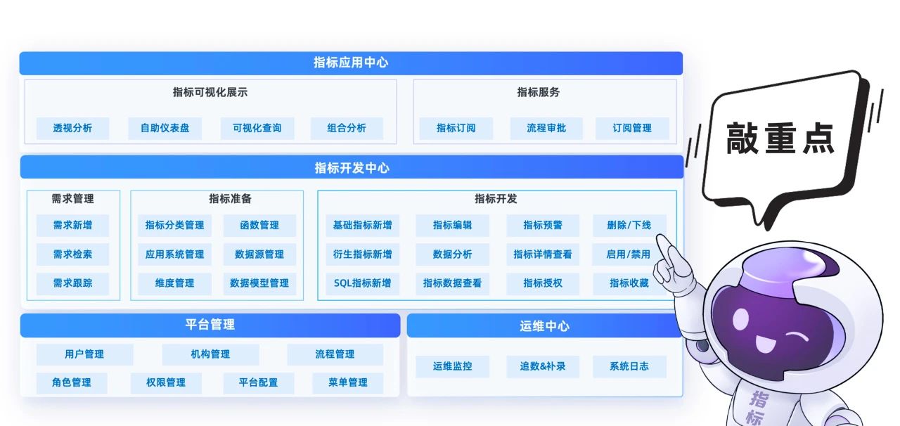 口徑不一致,主打一個“亂” 響應速度跟不上業務需求,主打一個“慢” 靈活性不足,主打一個“呆” 因此,建設一個貫穿整個企業的標準化、透明化、可持續的指標管理平臺成為解決以上問題的關鍵所在。 一站式指標管理平臺!很City 長亮科技指標管理平臺定位于一站式數據指標管理,覆蓋指標從定義、開發、計算、存儲到應用的全生命周期管理,通過提供標準化、規范化和高效化的指標管理服務,旨在解決口徑不一致、響應速度慢、靈活度不足等核心問題,實現指標數據的可視、可用、可管,助力企業數據洞察與決策效能的飛躍式提升。 新一代!更強大!很City! 歷經各類金融機構項目實踐的千錘百煉,長亮科技指標管理平臺圍繞“更高效、更精益、更安全”的目標,已從四大維度完成產品全面升級。 上手快:通過場景化菜單設計,一站式匯聚平臺核心操作指南,“新手用戶”從入門到精通,僅需一張菜單即可實現; 自動化:需求管理與指標標準化定義相結合,構建需求管理與指標開發之間的動態橋梁,同時指標研發全流程自動流轉,實現研發進度可視化跟蹤,通過流程聯動顯著提升團隊協作效率與項目執行精度; 廣適配:持續深化與國產軟硬件產品的信創適配調優,精準對接客戶的多樣化技術平臺需求,打造無縫兼容、靈活高效的產品; 智能化:引入先進的相似性對比功能,深度剖析血緣、維度、口徑等關鍵要素,即時呈現指標相似度提示,有效預防指標冗余與重復建設,并給予智能預警,確保指標體系的清晰與高效運轉。