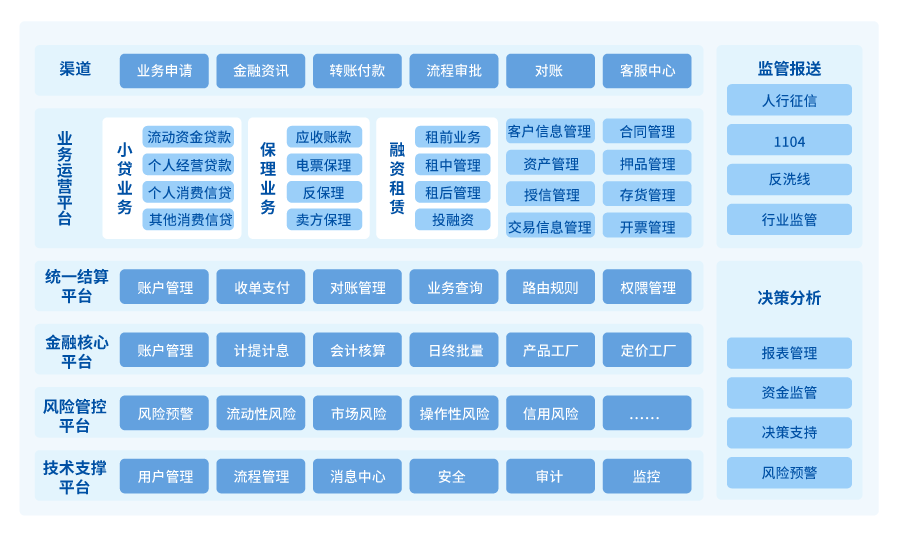 業務框架先進性:長亮科技金控平臺綜合業務系統可劃分為業務運營、金融核心、統一結算、風險管控、技術支撐五個平臺,將覆蓋金控集團各子業務系統的前、中、后臺業務管理、交易處理及風險管理,實現前臺各子業務系統受理、中后臺集中核算的規模化運營,大幅降低業務人員工作強度與壓力,提高業務處理效率;