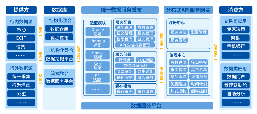 通過數據服務平臺,金融機構可實現對服務進行在線的可視化服務編排,減少重復開發,降低接口管理成本,快速為業務賦能,真正實現數據服務化。