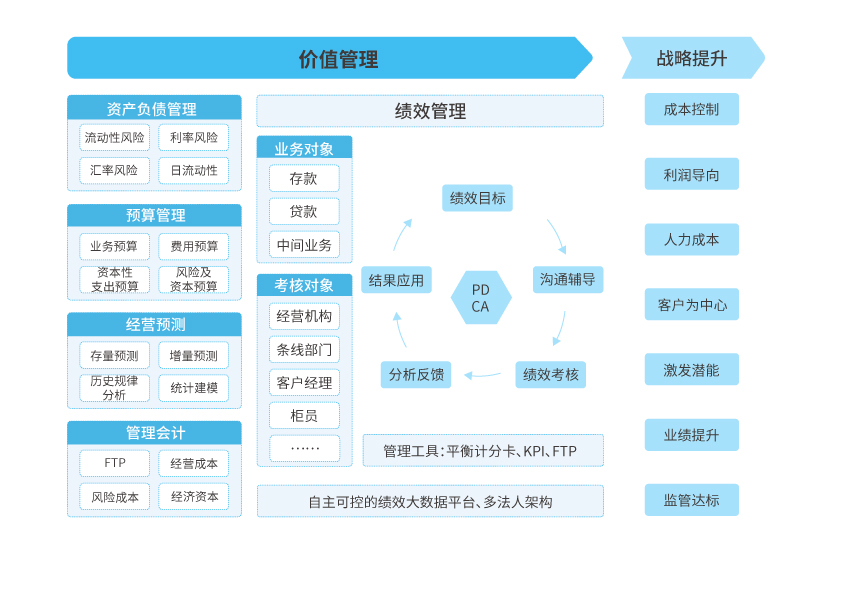 在業務架構上,績效考核平臺深度契合到銀行整體經營與價值管理中,通過深入結合銀行資產負債、預算等業務流程和管理需要,以績效大數據平臺為基礎,經營業績為重點,平衡計分卡、KPI等為工具,將銀行的戰略、資源、業務和行動有機地結合起來所構成的一個完整的管理體系,幫助銀行實現對機構、部門、柜員以及客戶經理等全員的精細化的績效管理,實現全行的戰略落地與績效提升。
