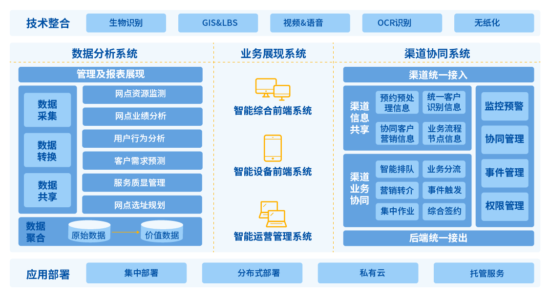 傳統網點由于系統間相互獨立,業務流程割裂,且網點管理工具薄弱,難以實現網點業務信息和客戶服務質量的量化分析,導致了網點業務優化和運營決策缺乏有效的數據支撐。