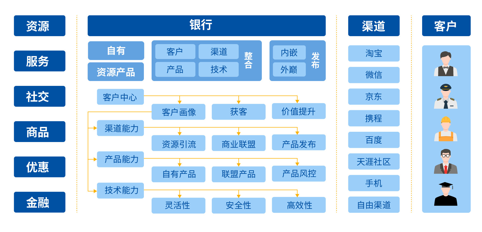 平臺通過對客戶體系、產(chǎn)品體系、渠道體系、營銷體系、風控體系的層層解偶,解決了互聯(lián)網(wǎng)金融產(chǎn)品、客戶、渠道靈活多變的市場需求,可以配置化實現(xiàn)產(chǎn)品設(shè)計、客戶分析、渠道擴展、營銷及風控策略定制。