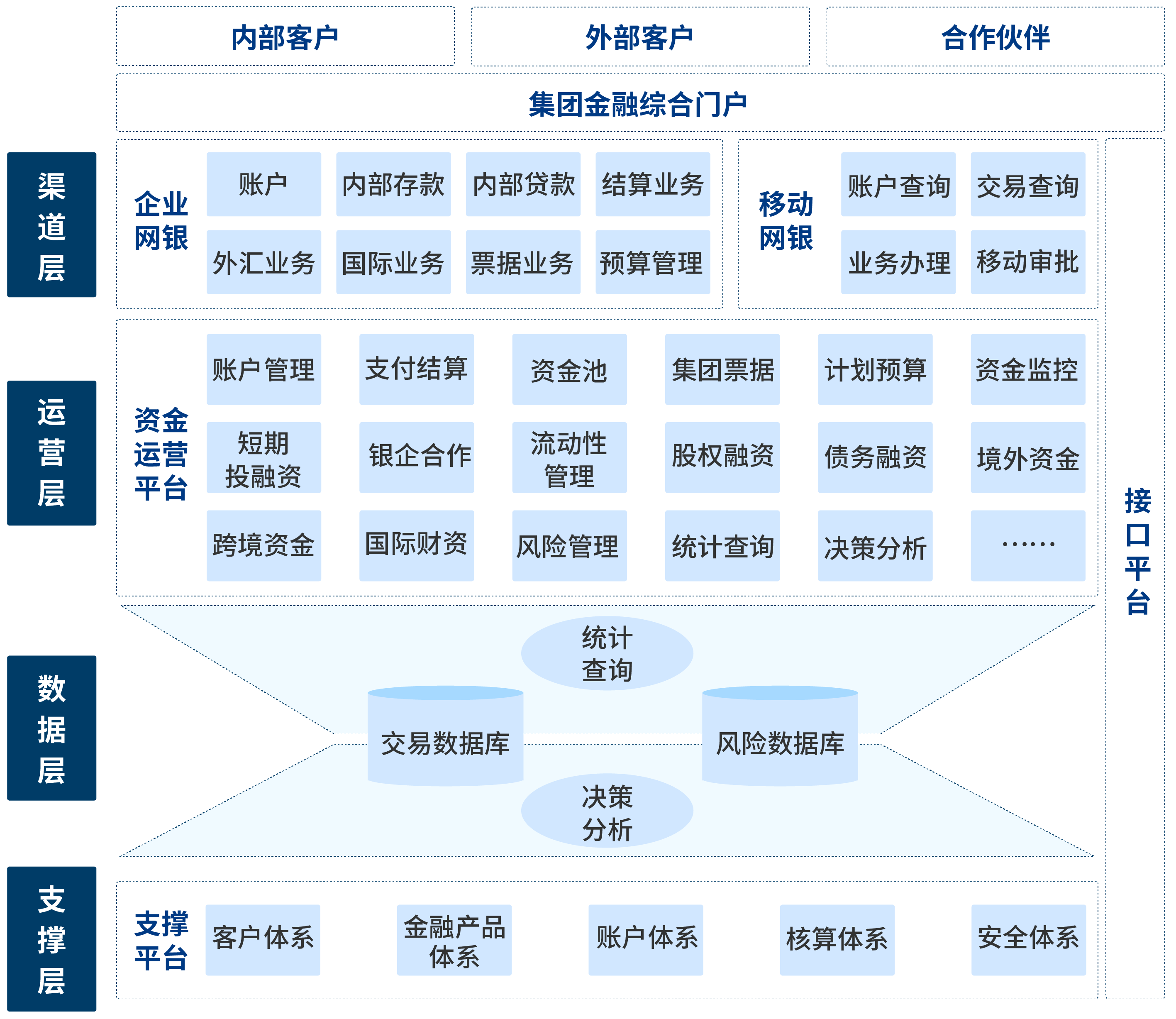 結(jié)合國內(nèi)外集團(tuán)資金管理行業(yè)的發(fā)展趨勢,依托銀行現(xiàn)金管理的先進(jìn)經(jīng)驗,打造先進(jìn)、安全、高效的集團(tuán)資金管理系統(tǒng),為大中型企業(yè)集團(tuán)提全面和可靠的資金管理解決方案,主要包括賬戶管理、資金預(yù)算、內(nèi)部存貸款、資金池管理、投融資管理、流動性管理、決策分析等功能。