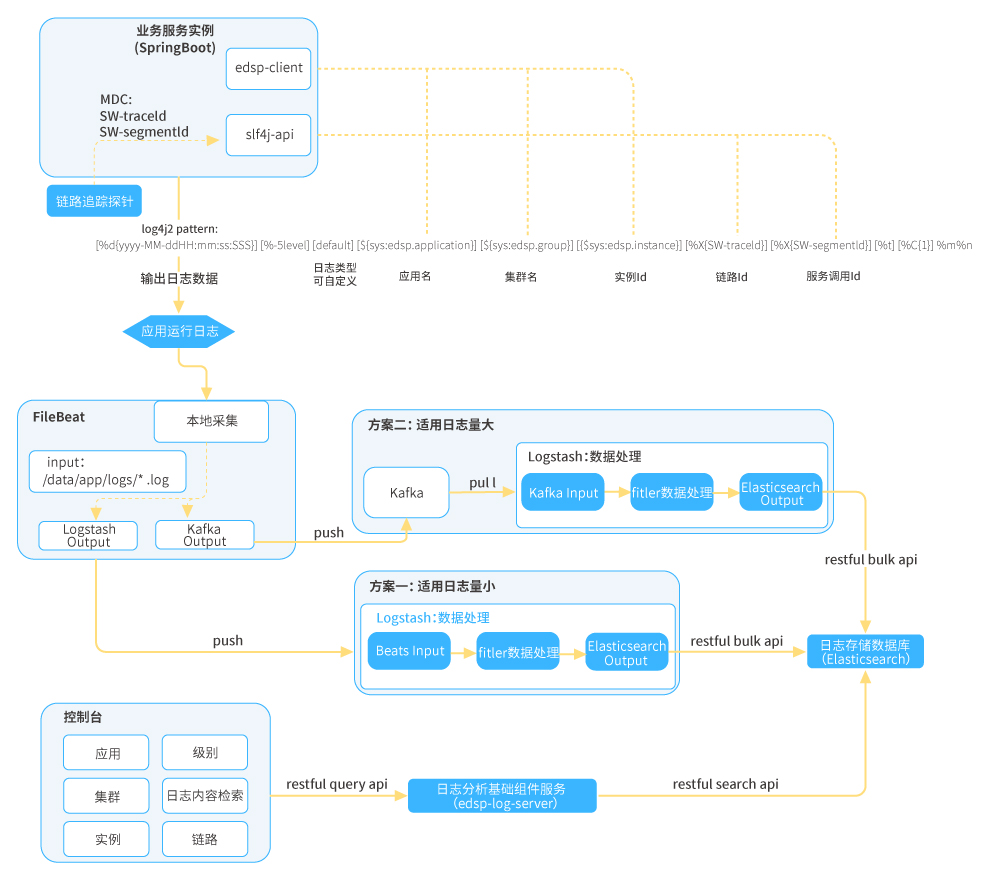 ● 應用日志分析:在日志收集和分析領域EFK是普遍采用的技術方案,但在應用日志分析的落地使用上,應用日志規范才是其核心的價值體系,對于企業級微服務日志觀測方面,日志規范體系需要在日志組件上落地以此作強規范約束;將規范中的某些關鍵數據以MDC方式注入,并按標準輸出到日志文件,日志收集組件到指定路徑收集日志數據推送至日志分析組件,日志分析組件按規范解析日志數據并進行持久化;平臺通過日志分析服務獲取日志數據。