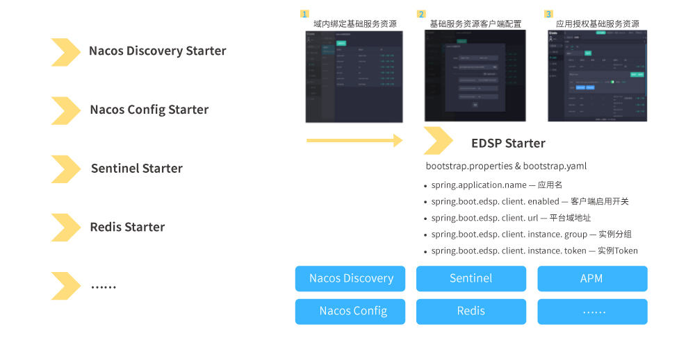 ■ 將業務應用集成這些基礎組件所需要的各種客戶端Starter包裝成一個簡單且統一的客戶端Starter,利用Spring Boot內置的監聽器機制,在業務應用啟動時可以連接到平臺上以此來獲取連接這些組件資源所需要的各種參數,在這個過程中也可以通過Token機制實現對組件資源的訪問權限控制,即降低了業務應用集成這些基礎組件的配置參數管理難度,也提高了對基礎組件使用的安全管控能力。