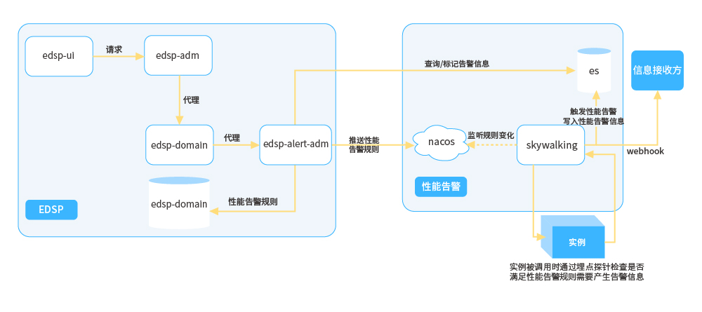 ● 性能告警:通過管控端配置告警規則提交到告警管理模塊落庫持久化,同時將告警規則推送至配置中心,性能告警組件依賴配置中心可以動態感知告警規則的變化并實時生效,然后在APM預處理接收的性能指標數據時立刻計算告警規則,對于滿足告警規則的指標數據立刻生成相應的告警事件,并持久化,隨后產生相關告警數據,并將告警數據持久化,同時推送至告警推送系統進行下一步推送操作。