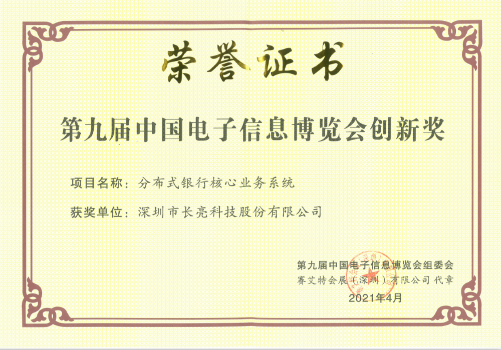 2021年4月9日,長亮科技作為金融信創(chuàng)代表企業(yè)出席第九屆中國電子信息博覽會-深圳市信創(chuàng)應(yīng)用發(fā)展研討會,其分布式核心系統(tǒng)憑借著自主創(chuàng)新技術(shù)及信創(chuàng)應(yīng)用的突出成績榮獲中國電子信息博覽會創(chuàng)新獎。