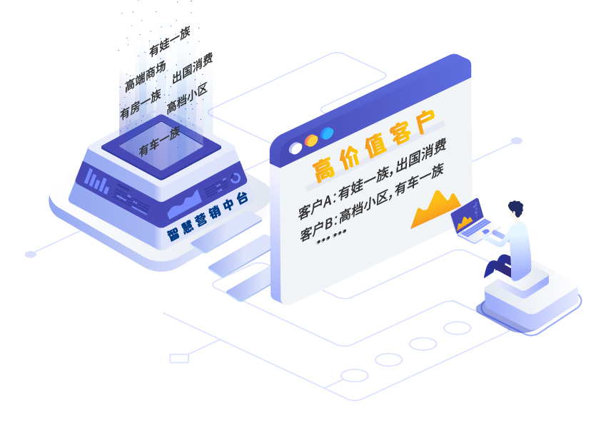 某銀行缺少標簽系統(tǒng),c端客戶大額資金動賬類信息無法及時傳遞到前臺,銀行客戶經(jīng)理很難掌握關(guān)鍵營銷機會,導致該行資金流失嚴重,80% c端零售客戶最終成為低價值客戶。而通過新一代智慧營銷中臺建立“有房一族”“有車一族”“有娃一族”“出國消費”“高檔小區(qū)”“高端商場”等標簽,構(gòu)建360用戶畫像,可快速發(fā)掘和識別出高價值潛力c端客戶。